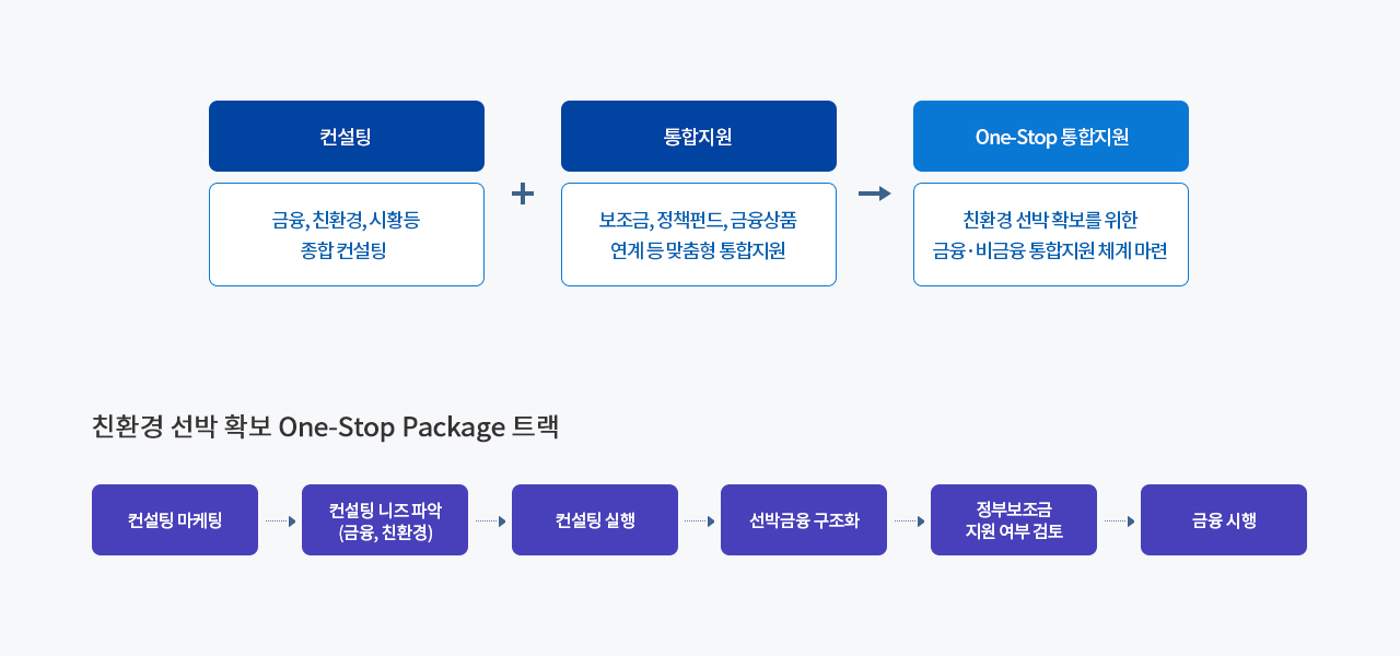 [컨설팅]금융,친환경,시황 등 종합 컨설팅 + [통합지원]보조금, 정책펀드, 금융상품 연계 등 맞춤형 통합지원 → [One-Stop통합지원] 친환경 선박 확보를 위한 금융·비금융 통합지원 체계 마련